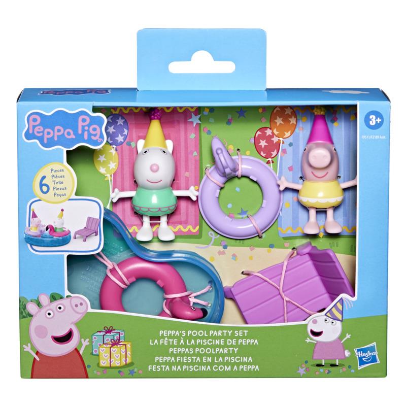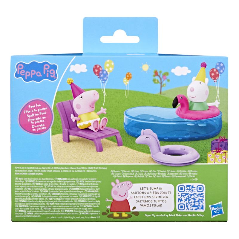 ◆可擺姿勢的 3 英寸大小的蘇西羊和佩佩豬人偶穿著泳衣和派對帽
